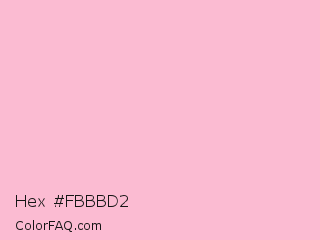 Hex #fbbbd2 Color is a very light rose color and the nearest color is Cotton Candy #ffb7d5. Hex code #fbbbd2 and RGB value is rgb(251,187,210). In RGB color space, this color is composed of 98% red, 73% green, 82% blue, In CMYK color space, this color is composed of 0% cyan, 25% magenta, 16% yellow , 2% black , In HSL color space, this color has a hue angle of 338° , 89% saturation and 86% lightness.