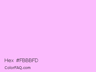 Hex #fbbbfd Color is a very light magenta color and the nearest color is Electric Lavender #f4bbff. Hex code #fbbbfd and RGB value is rgb(251,187,253). In RGB color space, this color is composed of 98% red, 73% green, 99% blue, In CMYK color space, this color is composed of 1% cyan, 26% magenta, 0% yellow , 1% black , In HSL color space, this color has a hue angle of 298° , 94% saturation and 86% lightness.