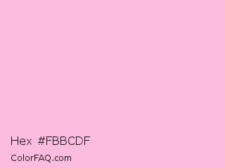 Hex #fbbcdf Color is a very light magenta color and the nearest color is Cupid #fbbeda. Hex code #fbbcdf and RGB value is rgb(251,188,223). In RGB color space, this color is composed of 98% red, 74% green, 87% blue, In CMYK color space, this color is composed of 0% cyan, 25% magenta, 11% yellow , 2% black , In HSL color space, this color has a hue angle of 327° , 89% saturation and 86% lightness.