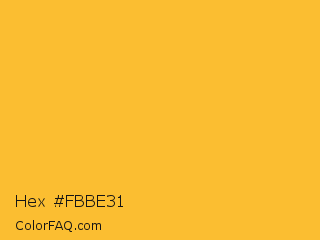 Hex #fbbe31 Color is a normal orange color and the nearest color is Saffron #f4c430. Hex code #fbbe31 and RGB value is rgb(251,190,49). In RGB color space, this color is composed of 98% red, 75% green, 19% blue, In CMYK color space, this color is composed of 0% cyan, 24% magenta, 80% yellow , 2% black , In HSL color space, this color has a hue angle of 42° , 96% saturation and 59% lightness.