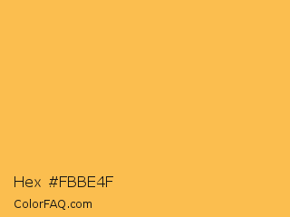 Hex #fbbe4f Color is a light orange color and the nearest color is Casablanca #f8b853. Hex code #fbbe4f and RGB value is rgb(251,190,79). In RGB color space, this color is composed of 98% red, 75% green, 31% blue, In CMYK color space, this color is composed of 0% cyan, 24% magenta, 69% yellow , 2% black , In HSL color space, this color has a hue angle of 39° , 96% saturation and 65% lightness.