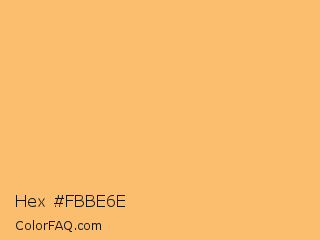 Hex #fbbe6e Color is a light orange color and the nearest color is Rajah #f7b668. Hex code #fbbe6e and RGB value is rgb(251,190,110). In RGB color space, this color is composed of 98% red, 75% green, 43% blue, In CMYK color space, this color is composed of 0% cyan, 24% magenta, 56% yellow , 2% black , In HSL color space, this color has a hue angle of 34° , 95% saturation and 71% lightness.