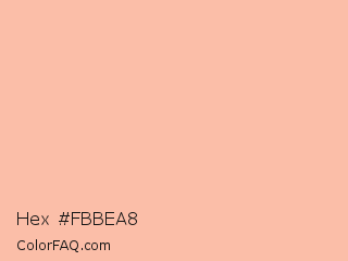 Hex #fbbea8 Color is a very light orange color and the nearest color is Wax Flower #ffc0a8. Hex code #fbbea8 and RGB value is rgb(251,190,168). In RGB color space, this color is composed of 98% red, 75% green, 66% blue, In CMYK color space, this color is composed of 0% cyan, 24% magenta, 33% yellow , 2% black , In HSL color space, this color has a hue angle of 16° , 91% saturation and 82% lightness.