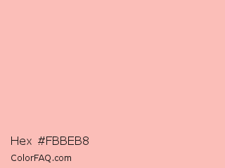 Hex #fbbeb8 Color is a very light red color and the nearest color is Melon #fdbcb4. Hex code #fbbeb8 and RGB value is rgb(251,190,184). In RGB color space, this color is composed of 98% red, 75% green, 72% blue, In CMYK color space, this color is composed of 0% cyan, 24% magenta, 27% yellow , 2% black , In HSL color space, this color has a hue angle of 5° , 89% saturation and 85% lightness.