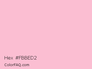 Hex #fbbed2 Color is a very light rose color and the nearest color is Bubble Gum #ffc1cc. Hex code #fbbed2 and RGB value is rgb(251,190,210). In RGB color space, this color is composed of 98% red, 75% green, 82% blue, In CMYK color space, this color is composed of 0% cyan, 24% magenta, 16% yellow , 2% black , In HSL color space, this color has a hue angle of 340° , 88% saturation and 86% lightness.