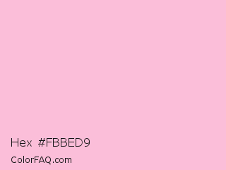 Hex #fbbed9 Color is a very light rose color and the nearest color is Cupid #fbbeda. Hex code #fbbed9 and RGB value is rgb(251,190,217). In RGB color space, this color is composed of 98% red, 75% green, 85% blue, In CMYK color space, this color is composed of 0% cyan, 24% magenta, 14% yellow , 2% black , In HSL color space, this color has a hue angle of 333° , 88% saturation and 86% lightness.