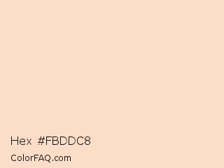 Hex #fbddc8 Color is a very light orange color and the nearest color is Unbleached Silk #ffddca. Hex code #fbddc8 and RGB value is rgb(251,221,200). In RGB color space, this color is composed of 98% red, 87% green, 78% blue, In CMYK color space, this color is composed of 0% cyan, 12% magenta, 20% yellow , 2% black , In HSL color space, this color has a hue angle of 25° , 86% saturation and 88% lightness.