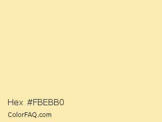 Hex #fbebb0 Color is a very light yellow color and the nearest color is Banana Mania Crayola #fbe7b2. Hex code #fbebb0 and RGB value is rgb(251,235,176). In RGB color space, this color is composed of 98% red, 92% green, 69% blue, In CMYK color space, this color is composed of 0% cyan, 6% magenta, 30% yellow , 2% black , In HSL color space, this color has a hue angle of 47° , 90% saturation and 84% lightness.