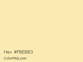 Hex #fbebb3 Color is a very light yellow color and the nearest color is Banana Mania Crayola #fbe7b2. Hex code #fbebb3 and RGB value is rgb(251,235,179). In RGB color space, this color is composed of 98% red, 92% green, 70% blue, In CMYK color space, this color is composed of 0% cyan, 6% magenta, 29% yellow , 2% black , In HSL color space, this color has a hue angle of 47° , 90% saturation and 84% lightness.