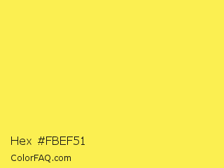 Hex #fbef51 Color is a light yellow color and the nearest color is Gorse #fff14f. Hex code #fbef51 and RGB value is rgb(251,239,81). In RGB color space, this color is composed of 98% red, 94% green, 32% blue, In CMYK color space, this color is composed of 0% cyan, 5% magenta, 68% yellow , 2% black , In HSL color space, this color has a hue angle of 56° , 96% saturation and 65% lightness.