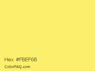 Hex #fbef6b Color is a light yellow color and the nearest color is Festival #fbe96c. Hex code #fbef6b and RGB value is rgb(251,239,107). In RGB color space, this color is composed of 98% red, 94% green, 42% blue, In CMYK color space, this color is composed of 0% cyan, 5% magenta, 57% yellow , 2% black , In HSL color space, this color has a hue angle of 55° , 95% saturation and 70% lightness.