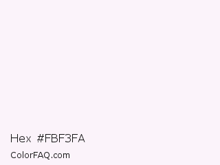 Hex #fbf3fa Color is a almost white magenta color and the nearest color is Wisp Pink #fef4f8. Hex code #fbf3fa and RGB value is rgb(251,243,250). In RGB color space, this color is composed of 98% red, 95% green, 98% blue, In CMYK color space, this color is composed of 0% cyan, 3% magenta, 0% yellow , 2% black , In HSL color space, this color has a hue angle of 308° , 50% saturation and 97% lightness.