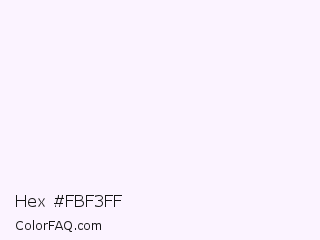 Hex #fbf3ff Color is a almost white purple color and the nearest color is Magnolia #f8f4ff. Hex code #fbf3ff and RGB value is rgb(251,243,255). In RGB color space, this color is composed of 98% red, 95% green, 100% blue, In CMYK color space, this color is composed of 2% cyan, 5% magenta, 0% yellow , 0% black , In HSL color space, this color has a hue angle of 280° , 100% saturation and 98% lightness.