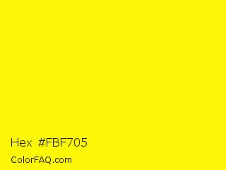 Hex #fbf705 Color is a normal yellow color and the nearest color is Yellow Sunshine #fff700. Hex code #fbf705 and RGB value is rgb(251,247,5). In RGB color space, this color is composed of 98% red, 97% green, 2% blue, In CMYK color space, this color is composed of 0% cyan, 2% magenta, 98% yellow , 2% black , In HSL color space, this color has a hue angle of 59° , 97% saturation and 50% lightness.