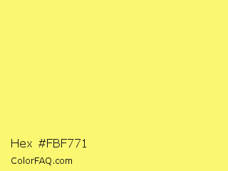 Hex #fbf771 Color is a light yellow color and the nearest color is Paris Daisy #fff46e. Hex code #fbf771 and RGB value is rgb(251,247,113). In RGB color space, this color is composed of 98% red, 97% green, 44% blue, In CMYK color space, this color is composed of 0% cyan, 2% magenta, 55% yellow , 2% black , In HSL color space, this color has a hue angle of 58° , 95% saturation and 71% lightness.