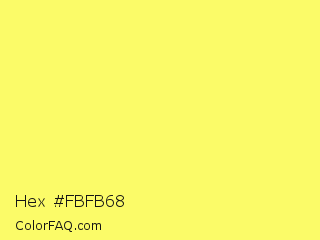 Hex #fbfb68 Color is a light yellow color and the nearest color is Laser Lemon #ffff66. Hex code #fbfb68 and RGB value is rgb(251,251,104). In RGB color space, this color is composed of 98% red, 98% green, 41% blue, In CMYK color space, this color is composed of 0% cyan, 0% magenta, 59% yellow , 2% black , In HSL color space, this color has a hue angle of 60° , 95% saturation and 70% lightness.
