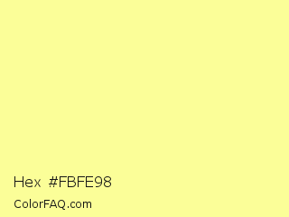 Hex #fbfe98 Color is a light yellow color and the nearest color is Pastel Yellow #fdfd96. Hex code #fbfe98 and RGB value is rgb(251,254,152). In RGB color space, this color is composed of 98% red, 100% green, 60% blue, In CMYK color space, this color is composed of 1% cyan, 0% magenta, 40% yellow , 0% black , In HSL color space, this color has a hue angle of 62° , 98% saturation and 80% lightness.