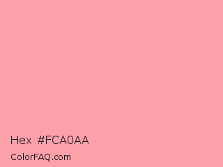 Hex #fca0aa Color is a very light red color and the nearest color is Sweet Pink #fd9fa2. Hex code #fca0aa and RGB value is rgb(252,160,170). In RGB color space, this color is composed of 99% red, 63% green, 67% blue, In CMYK color space, this color is composed of 0% cyan, 37% magenta, 33% yellow , 1% black , In HSL color space, this color has a hue angle of 353° , 94% saturation and 81% lightness.