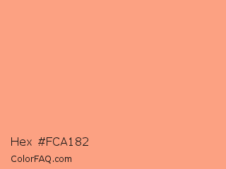 Hex #fca182 Color is a light color and the nearest color is Vivid Tangerine #ffa089. Hex code #fca182 and RGB value is rgb(252,161,130). In RGB color space, this color is composed of 99% red, 63% green, 51% blue, In CMYK color space, this color is composed of 0% cyan, 36% magenta, 48% yellow , 1% black , In HSL color space, this color has a hue angle of 15° , 95% saturation and 75% lightness.