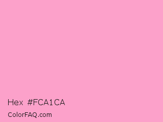 Hex #fca1ca Color is a very light rose color and the nearest color is Carnation Pink #ffa6c9. Hex code #fca1ca and RGB value is rgb(252,161,202). In RGB color space, this color is composed of 99% red, 63% green, 79% blue, In CMYK color space, this color is composed of 0% cyan, 36% magenta, 20% yellow , 1% black , In HSL color space, this color has a hue angle of 333° , 94% saturation and 81% lightness.