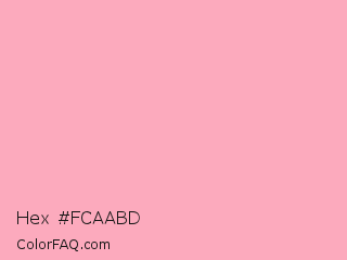 Hex #fcaabd Color is a very light red color and the nearest color is Nadeshiko Pink #f6adc6. Hex code #fcaabd and RGB value is rgb(252,170,189). In RGB color space, this color is composed of 99% red, 67% green, 74% blue, In CMYK color space, this color is composed of 0% cyan, 33% magenta, 25% yellow , 1% black , In HSL color space, this color has a hue angle of 346° , 93% saturation and 83% lightness.