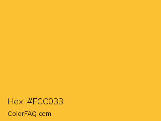 Hex #fcc033 Color is a normal orange color and the nearest color is Saffron #f4c430. Hex code #fcc033 and RGB value is rgb(252,192,51). In RGB color space, this color is composed of 99% red, 75% green, 20% blue, In CMYK color space, this color is composed of 0% cyan, 24% magenta, 80% yellow , 1% black , In HSL color space, this color has a hue angle of 42° , 97% saturation and 59% lightness.
