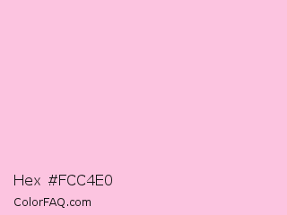 Hex #fcc4e0 Color is a very light rose color and the nearest color is Chantilly #f8c3df. Hex code #fcc4e0 and RGB value is rgb(252,196,224). In RGB color space, this color is composed of 99% red, 77% green, 88% blue, In CMYK color space, this color is composed of 0% cyan, 22% magenta, 11% yellow , 1% black , In HSL color space, this color has a hue angle of 330° , 90% saturation and 88% lightness.