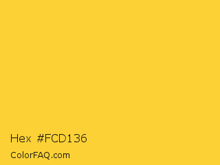 Hex #fcd136 Color is a normal yellow color and the nearest color is Sunglow #ffcc33. Hex code #fcd136 and RGB value is rgb(252,209,54). In RGB color space, this color is composed of 99% red, 82% green, 21% blue, In CMYK color space, this color is composed of 0% cyan, 17% magenta, 79% yellow , 1% black , In HSL color space, this color has a hue angle of 47° , 97% saturation and 60% lightness.