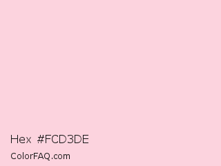Hex #fcd3de Color is a very light rose color and the nearest color is Pastel Pink #ffd1dc. Hex code #fcd3de and RGB value is rgb(252,211,222). In RGB color space, this color is composed of 99% red, 83% green, 87% blue, In CMYK color space, this color is composed of 0% cyan, 16% magenta, 12% yellow , 1% black , In HSL color space, this color has a hue angle of 344° , 87% saturation and 91% lightness.