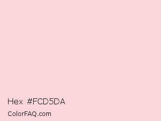 Hex #fcd5da Color is a very light red color and the nearest color is Cosmos #ffd8d9. Hex code #fcd5da and RGB value is rgb(252,213,218). In RGB color space, this color is composed of 99% red, 84% green, 85% blue, In CMYK color space, this color is composed of 0% cyan, 15% magenta, 13% yellow , 1% black , In HSL color space, this color has a hue angle of 352° , 87% saturation and 91% lightness.