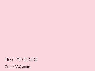 Hex #fcd6de Color is a very light red color and the nearest color is Pale Pink #fadadd. Hex code #fcd6de and RGB value is rgb(252,214,222). In RGB color space, this color is composed of 99% red, 84% green, 87% blue, In CMYK color space, this color is composed of 0% cyan, 15% magenta, 12% yellow , 1% black , In HSL color space, this color has a hue angle of 347° , 86% saturation and 91% lightness.