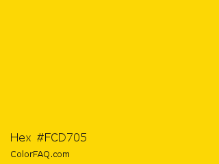 Hex #fcd705 Color is a normal yellow color and the nearest color is Gold #ffd700. Hex code #fcd705 and RGB value is rgb(252,215,5). In RGB color space, this color is composed of 99% red, 84% green, 2% blue, In CMYK color space, this color is composed of 0% cyan, 15% magenta, 98% yellow , 1% black , In HSL color space, this color has a hue angle of 51° , 98% saturation and 50% lightness.