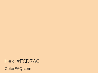 Hex #fcd7ac Color is a very light orange color and the nearest color is Light Apricot #fdd5b1. Hex code #fcd7ac and RGB value is rgb(252,215,172). In RGB color space, this color is composed of 99% red, 84% green, 67% blue, In CMYK color space, this color is composed of 0% cyan, 15% magenta, 32% yellow , 1% black , In HSL color space, this color has a hue angle of 32° , 93% saturation and 83% lightness.