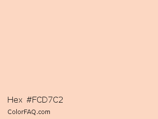 Hex #fcd7c2 Color is a very light orange color and the nearest color is Very Pale Orange #ffdfbf. Hex code #fcd7c2 and RGB value is rgb(252,215,194). In RGB color space, this color is composed of 99% red, 84% green, 76% blue, In CMYK color space, this color is composed of 0% cyan, 15% magenta, 23% yellow , 1% black , In HSL color space, this color has a hue angle of 22° , 91% saturation and 87% lightness.