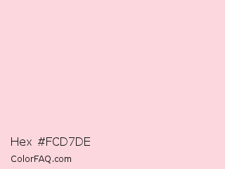 Hex #fcd7de Color is a very light red color and the nearest color is Pale Pink #fadadd. Hex code #fcd7de and RGB value is rgb(252,215,222). In RGB color space, this color is composed of 99% red, 84% green, 87% blue, In CMYK color space, this color is composed of 0% cyan, 15% magenta, 12% yellow , 1% black , In HSL color space, this color has a hue angle of 349° , 86% saturation and 92% lightness.