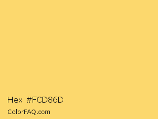 Hex #fcd86d Color is a light orange color and the nearest color is Goldenrod #fcd667. Hex code #fcd86d and RGB value is rgb(252,216,109). In RGB color space, this color is composed of 99% red, 85% green, 43% blue, In CMYK color space, this color is composed of 0% cyan, 14% magenta, 57% yellow , 1% black , In HSL color space, this color has a hue angle of 45° , 96% saturation and 71% lightness.