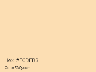 Hex #fcdeb3 Color is a very light orange color and the nearest color is Frangipani #ffdeb3. Hex code #fcdeb3 and RGB value is rgb(252,222,179). In RGB color space, this color is composed of 99% red, 87% green, 70% blue, In CMYK color space, this color is composed of 0% cyan, 12% magenta, 29% yellow , 1% black , In HSL color space, this color has a hue angle of 35° , 92% saturation and 85% lightness.