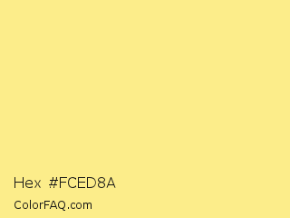 Hex #fced8a Color is a light yellow color and the nearest color is Sweet Corn #fbea8c. Hex code #fced8a and RGB value is rgb(252,237,138). In RGB color space, this color is composed of 99% red, 93% green, 54% blue, In CMYK color space, this color is composed of 0% cyan, 6% magenta, 45% yellow , 1% black , In HSL color space, this color has a hue angle of 52° , 95% saturation and 76% lightness.