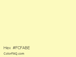Hex #fcfabe Color is a very light yellow color and the nearest color is Very Pale Yellow #ffffbf. Hex code #fcfabe and RGB value is rgb(252,250,190). In RGB color space, this color is composed of 99% red, 98% green, 75% blue, In CMYK color space, this color is composed of 0% cyan, 1% magenta, 25% yellow , 1% black , In HSL color space, this color has a hue angle of 58° , 91% saturation and 87% lightness.