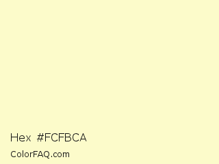 Hex #fcfbca Color is a very light yellow color and the nearest color is Lemon Chiffon #fffacd. Hex code #fcfbca and RGB value is rgb(252,251,202). In RGB color space, this color is composed of 99% red, 98% green, 79% blue, In CMYK color space, this color is composed of 0% cyan, 0% magenta, 20% yellow , 1% black , In HSL color space, this color has a hue angle of 59° , 89% saturation and 89% lightness.