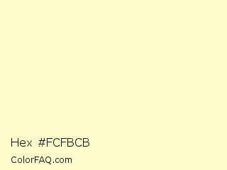Hex #fcfbcb Color is a very light yellow color and the nearest color is Lemon Chiffon #fffacd. Hex code #fcfbcb and RGB value is rgb(252,251,203). In RGB color space, this color is composed of 99% red, 98% green, 80% blue, In CMYK color space, this color is composed of 0% cyan, 0% magenta, 19% yellow , 1% black , In HSL color space, this color has a hue angle of 59° , 89% saturation and 89% lightness.