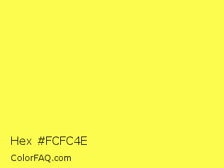Hex #fcfc4e Color is a light yellow color and the nearest color is Lemon Yellow #fff44f. Hex code #fcfc4e and RGB value is rgb(252,252,78). In RGB color space, this color is composed of 99% red, 99% green, 31% blue, In CMYK color space, this color is composed of 0% cyan, 0% magenta, 69% yellow , 1% black , In HSL color space, this color has a hue angle of 60° , 97% saturation and 65% lightness.
