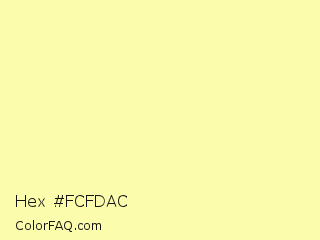 Hex #fcfdac Color is a very light yellow color and the nearest color is Drover #fdf7ad. Hex code #fcfdac and RGB value is rgb(252,253,172). In RGB color space, this color is composed of 99% red, 99% green, 67% blue, In CMYK color space, this color is composed of 0% cyan, 0% magenta, 32% yellow , 1% black , In HSL color space, this color has a hue angle of 61° , 95% saturation and 83% lightness.