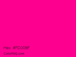 Hex #fd008f Color is a normal magenta color and the nearest color is Magenta Process #ff0090. Hex code #fd008f and RGB value is rgb(253,0,143). In RGB color space, this color is composed of 99% red, 0% green, 56% blue, In CMYK color space, this color is composed of 0% cyan, 100% magenta, 43% yellow , 1% black , In HSL color space, this color has a hue angle of 326° , 100% saturation and 50% lightness.