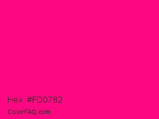 Hex #fd0782 Color is a normal rose color and the nearest color is Rose #ff007f. Hex code #fd0782 and RGB value is rgb(253,7,130). In RGB color space, this color is composed of 99% red, 3% green, 51% blue, In CMYK color space, this color is composed of 0% cyan, 97% magenta, 49% yellow , 1% black , In HSL color space, this color has a hue angle of 330° , 98% saturation and 51% lightness.