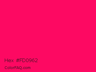 Hex #fd0962 Color is a normal rose color and the nearest color is Vivid Raspberry #ff006c. Hex code #fd0962 and RGB value is rgb(253,9,98). In RGB color space, this color is composed of 99% red, 4% green, 38% blue, In CMYK color space, this color is composed of 0% cyan, 96% magenta, 61% yellow , 1% black , In HSL color space, this color has a hue angle of 338° , 98% saturation and 51% lightness.