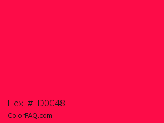 Hex #fd0c48 Color is a normal red color and the nearest color is American Rose #ff033e. Hex code #fd0c48 and RGB value is rgb(253,12,72). In RGB color space, this color is composed of 99% red, 5% green, 28% blue, In CMYK color space, this color is composed of 0% cyan, 95% magenta, 72% yellow , 1% black , In HSL color space, this color has a hue angle of 345° , 98% saturation and 52% lightness.