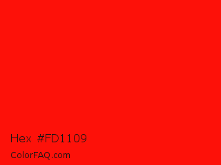 Hex #fd1109 Color is a normal red color and the nearest color is Candy Apple Red #ff0800. Hex code #fd1109 and RGB value is rgb(253,17,9). In RGB color space, this color is composed of 99% red, 7% green, 4% blue, In CMYK color space, this color is composed of 0% cyan, 93% magenta, 96% yellow , 1% black , In HSL color space, this color has a hue angle of 2° , 98% saturation and 51% lightness.