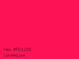 Hex #fd1255 Color is a normal rose color and the nearest color is Awesome #ff2052. Hex code #fd1255 and RGB value is rgb(253,18,85). In RGB color space, this color is composed of 99% red, 7% green, 33% blue, In CMYK color space, this color is composed of 0% cyan, 93% magenta, 66% yellow , 1% black , In HSL color space, this color has a hue angle of 343° , 98% saturation and 53% lightness.
