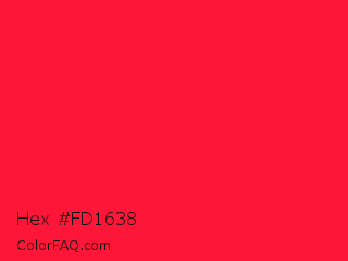 Hex #fd1638 Color is a normal red color and the nearest color is Torch Red #fd0e35. Hex code #fd1638 and RGB value is rgb(253,22,56). In RGB color space, this color is composed of 99% red, 9% green, 22% blue, In CMYK color space, this color is composed of 0% cyan, 91% magenta, 78% yellow , 1% black , In HSL color space, this color has a hue angle of 351° , 98% saturation and 54% lightness.